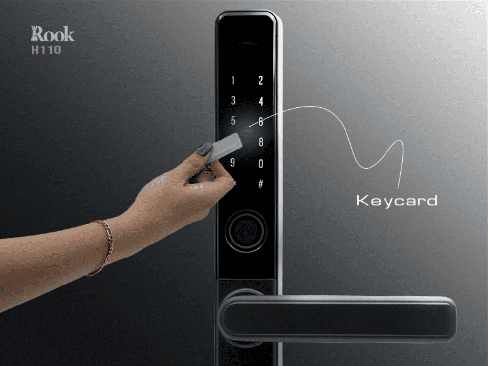 سنسور اثر انگشتی این قفل یا همان دستگیره هوشمند اثر انگشتی از نوع خازنی بوده که سرعت و دقت پردازش بالایی در تشخیص هویت کاربران دارد. به علاوه عواملی مثل سرما و یا گرمای هوا هیچ اختلالی در شناسایی آن ایجاد نمیکند. کارتهایی که توسط قفل روک H110 ساپورت میشوند از قبیل کارتهای بزرگ (مانند کارتهای شتاب بانکی)، key tag (جاسوئیچی مانند) و اسمارت کارت (کارتهای کوچک برچسبدار مخصوص موبایل) میباشند.